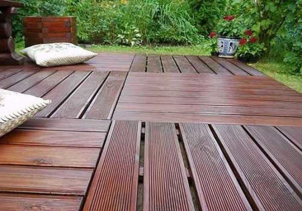 Есть еще своеобразный способ борьбы с температурным расширением. Настил собирают из небольших по длине отрезков. Подгонять их вплотную не нужно, так как рекомендуют даже зазоры оставлять — для эффективного схода воды. Эти зазоры и будут компенсировать увеличение или уменьшение размеров. Получается своего рода паркет. Есть даже покрытие с таким названием — садовый паркет. Его делают из полимерных досок. Вот только стоимость его выше намного, чем у собранного самостоятельно. Тут можно и с цветами, фактурами поиграть и получить очень интересное покрытие для террасы.
