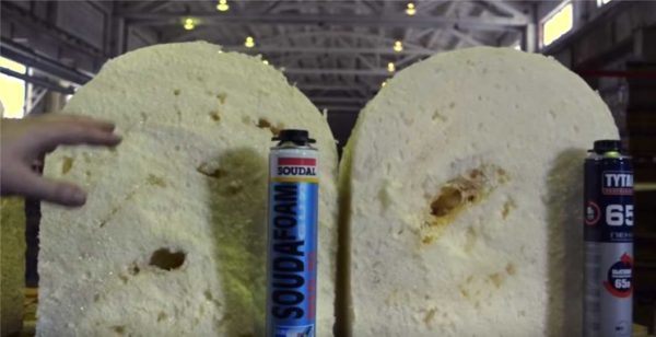 Какая монтажная пена лучше? Та, в которой больших полостей меньше - Очень быстрая, практически моментальная полимеризация (например, Soudal 2K). Применяются в работах на высоте, когда ждать даже 30 минут невозможно. Они используются промышленными альпинистами при монтажных и ремонтных работах.